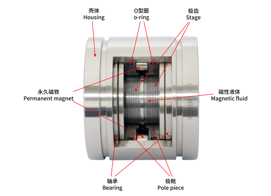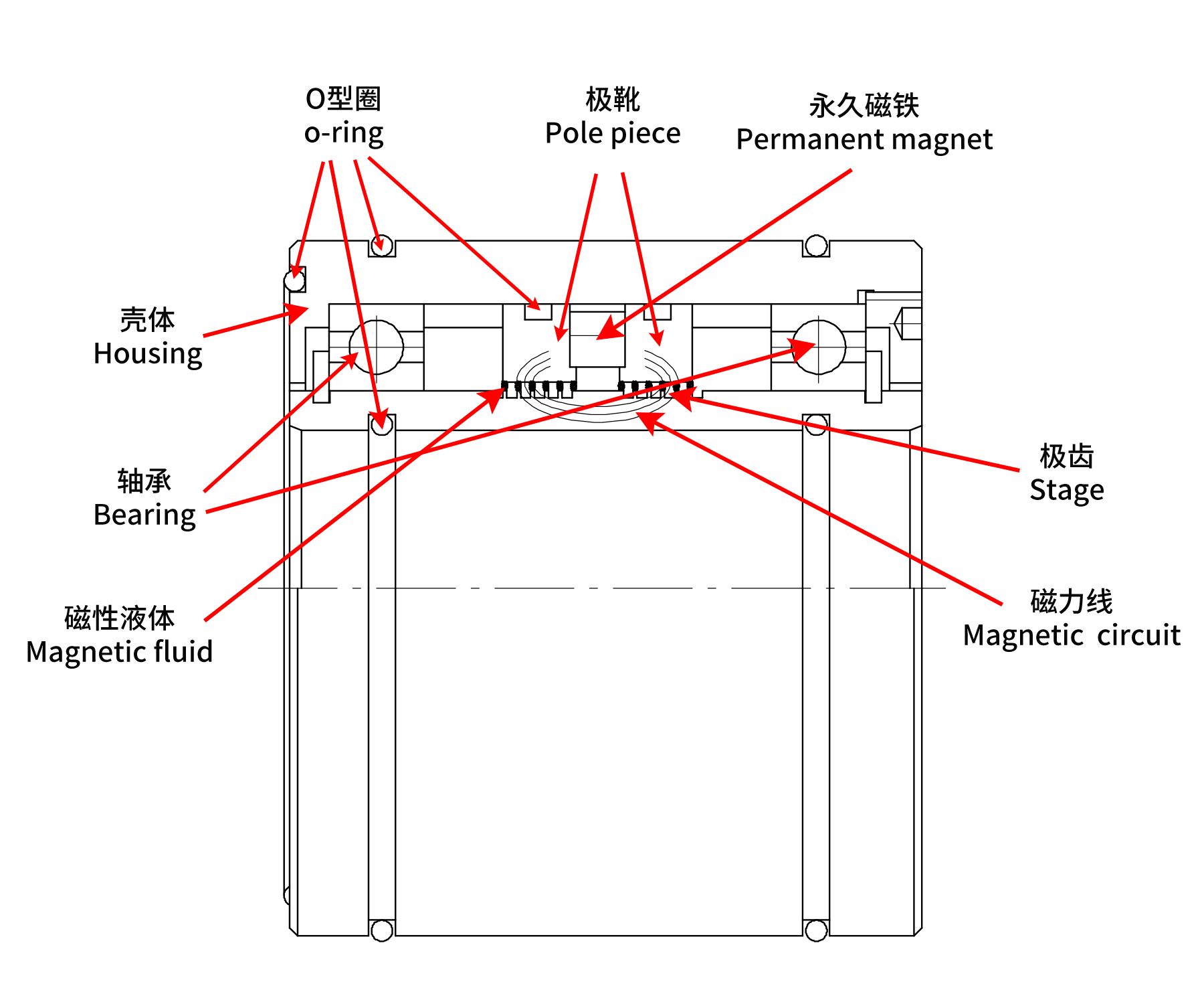 磁流体密封属“液-固”接触式密封,无磨损。它不存在传统密封中,密封件与旋转轴固-固两相界面之间的磨损泄漏问题,100%动力给进传输,无转矩损失